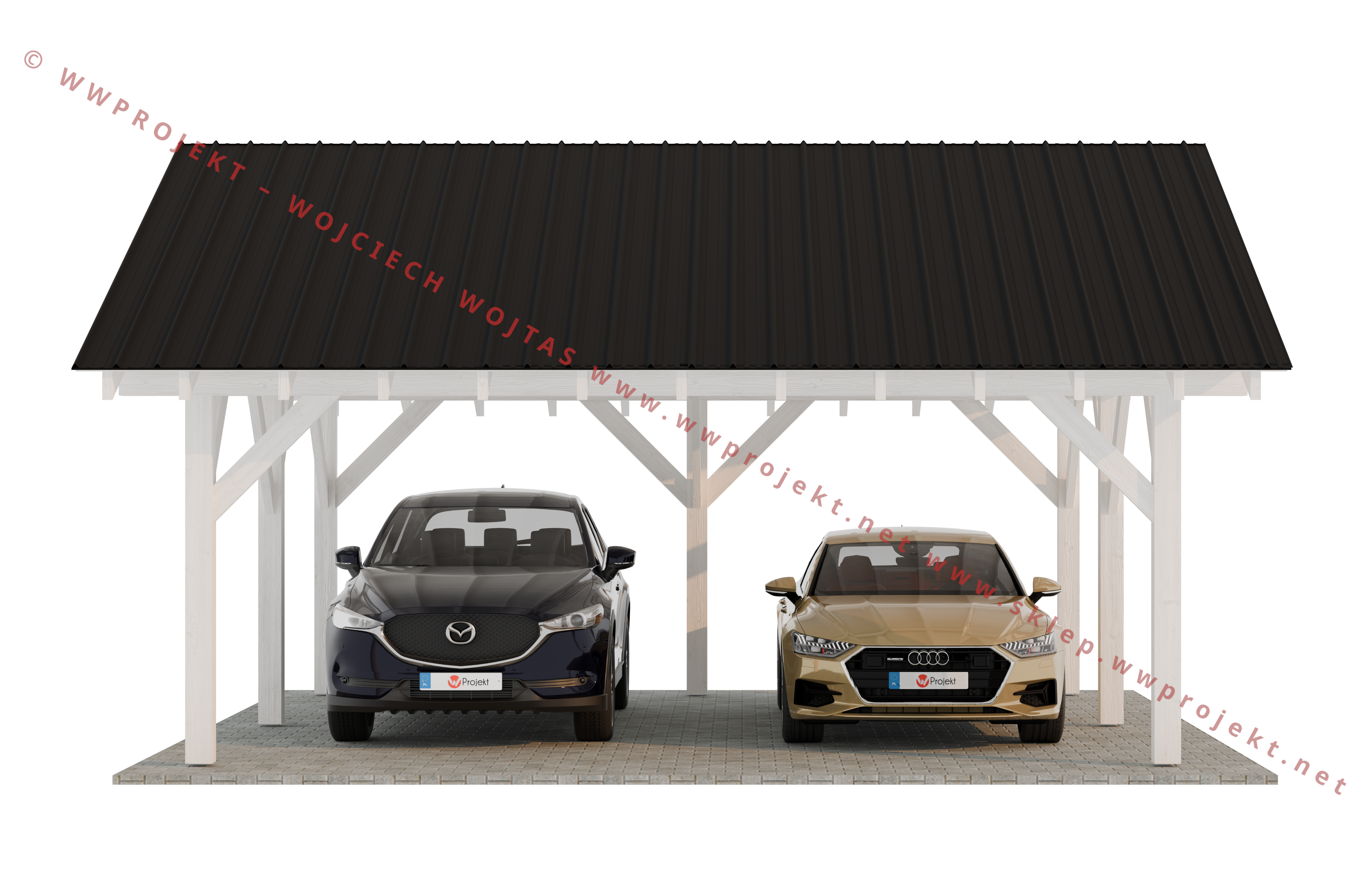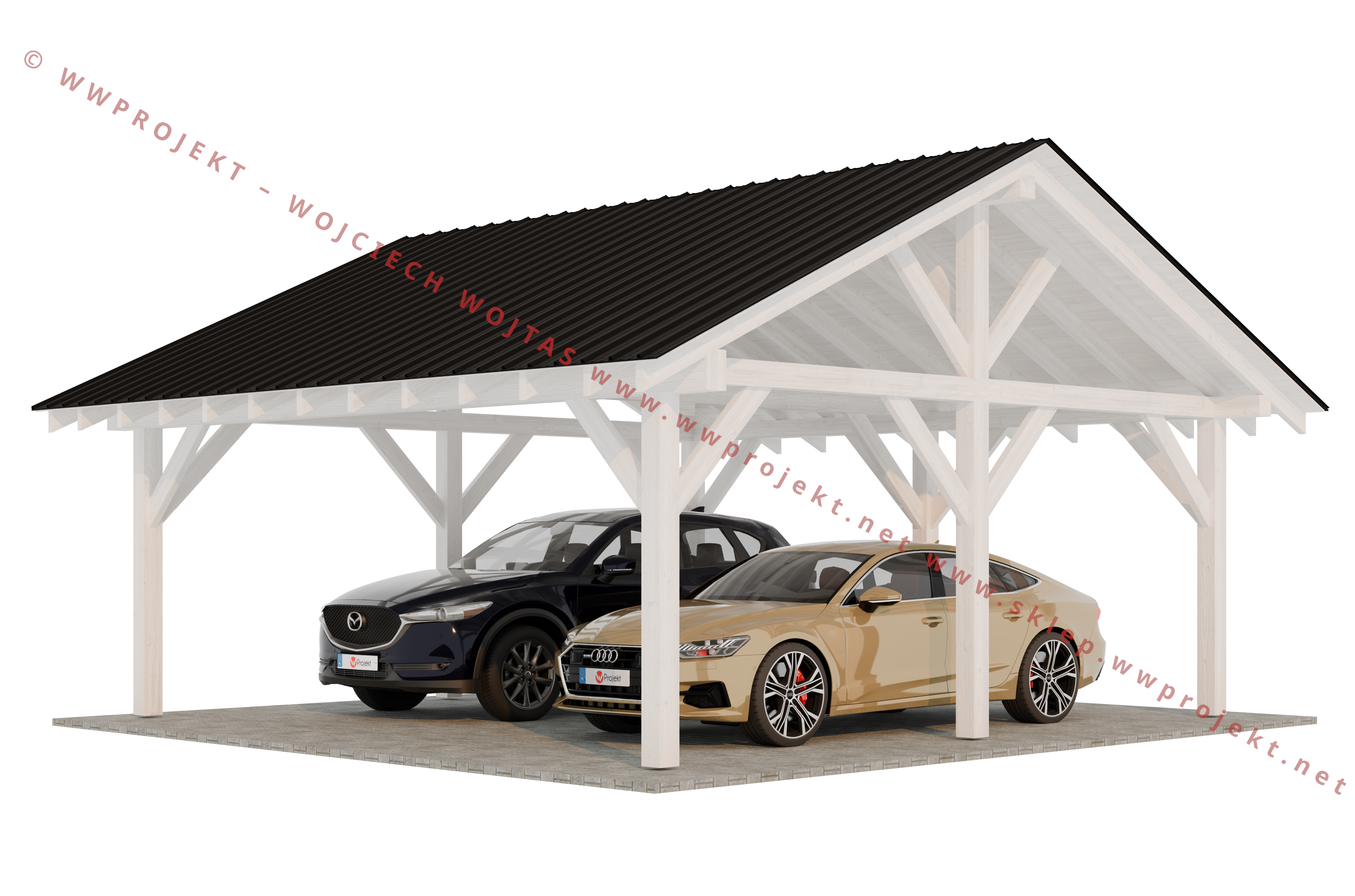 Projekt wiaty samochodowej drewnianej 6x6, dwustanowiskowa, dach dwuspadowy